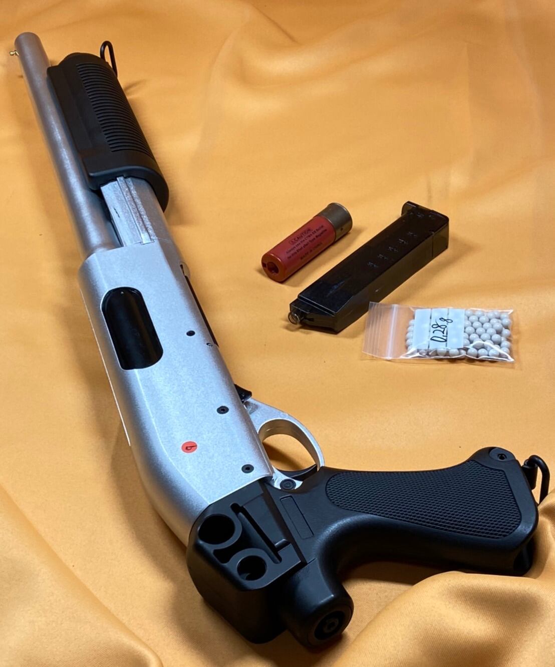 例えるなら、のんばいーんカスタム化したマルゼンのca870単発発射に、シーマや東京マルイのベネリM3シェル型マガジンのロマンを足し、エアコキ長物の雄、VSRの様な静かさと飛距離が出る、取り回しのよい軽量なショットガン。そんなイメージです。